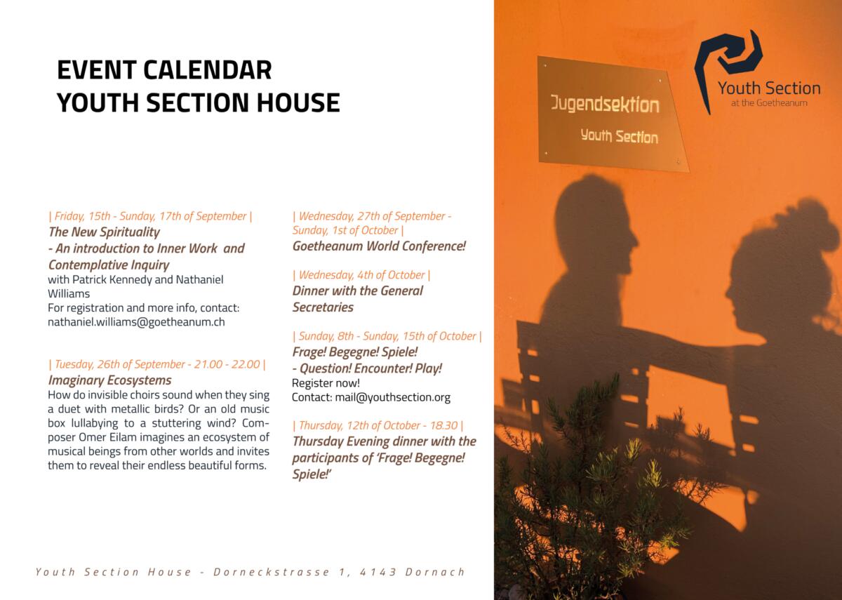 The last time we sent out a newsletter it was early summer. Now the pumpkins are big on my neighbor’s vine and plants are going to seed. Since summer there has been an international network gathering at the Goetheanum, a founding event for a new Youth Section working group in Germany, an international youth conference in Matsevani (Georgia), events in the USA and Brazil, and a youth conference to celebrate the inauguration of the Oceanic Youth Circle in Australia. Friends from throughout the network have sent in articles and images from most of these events, which are included here.