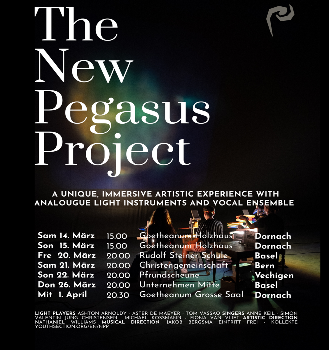 The New Pegasus Project arrises out of an impulse of finding active ways to engage with screens and starting conversation around the presence of screens and media in our modern world. With four unique new instruments designed by Nathaniel Williams - Light Horses - light, shapes and colors are created in real time on a screen by four Light Horse Players.
